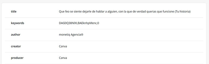 Me puse a ver la metadata del archivo y, además del título extraño y la confirmación de que fue hecho en Canva, encontré algo curioso en el campo de autor. No el nombre de una persona, sino de una agencia con todo y logo de marca registrada: monetiq Agencia.