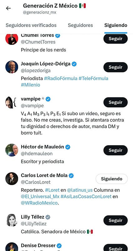 Otra señal de alarma vino de la actividad en redes sociales de las cuentas del movimiento de Generación Z México. En Twitter, el perfil seguía a diversas figuras de derecha como Lily Tellez, América Rangel, Chumel Torres, entre otras.