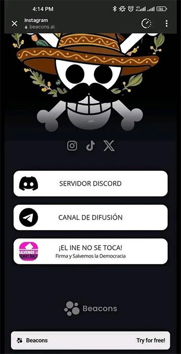 Además, la cuenta tenía en su perfil un link a una landing page con enlaces a su canal de Telegram, su servidor de Discord e, inexplicablemente, a una petición de firmas del movimiento El INE no se toca.