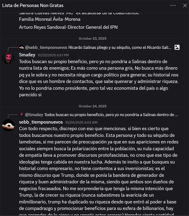 Me pasé un buen rato leyendo los mensajes del Discord y, más allá de que alguien intentara armar un movimiento falso, me queda claro que hay inquietudes políticas sinceras y ganas de organizarse. Entre la montaña de posteos de hispanistas rancios y cromadores de Salinas Pliego, me tocó leer muchos mensajes genuinamente preocupados por la situación de sus ciudades y del país en general. El servidor era una trampa, pero el espíritu que los llevó ahí fue genuino. La parte importante siempre fue real.