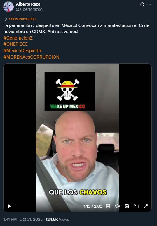 El pasado jueves 29 de octubre, Twitter se inundó con imágenes de la jolly roger con el sombrero de paja, la bandera que ondean los protagonistas de One Piece. En distintos videos, voces anónimas aseguraban que integrantes de la generación Z se estaban organizando para marchar el próximo 15 de noviembre y exigir la revocación de mandato de la presidenta Claudia Sheinbaum. Adoptando la iconografía de One Piece que se usó en las movilizaciones juveniles de Nepal y Madagascar (que terminaron con presidentes derrocados), este nuevo movimiento anunciaba su nacimiento en México con la promesa de canalizar el descontento político de una nueva generación.