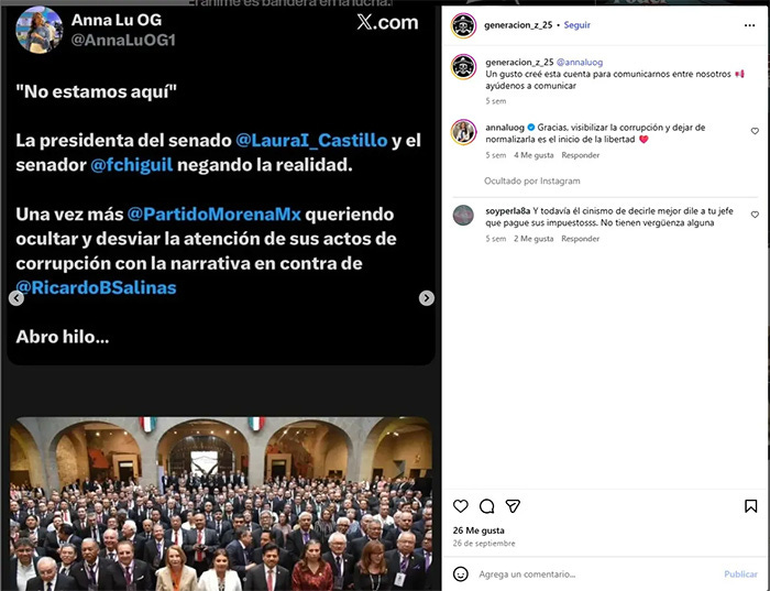 El 26 de septiembre, una cuenta que ahora se hace llamar “generacion_z_25”, y que usa la calavera con el sombrero de paja en sus publicaciones, publicó en Instagram un carrusel con mensajes contra Morena y a favor del empresario Ricardo Salinas Pliego. El mensaje aseguraba haber creado la cuenta “para comunicarnos entre nosotros”. El primer comentario provenía de Anna Lu, conductora de Azteca Noticias, y que publica contenido a favor del movimiento de Generación Z México en sus redes sociales. Dos días después, esa misma cuenta publicó una convocatoria para marchar hacia Palacio Nacional. Todo esto ocurrió en un momento en el que el movimiento aún no existía públicamente.